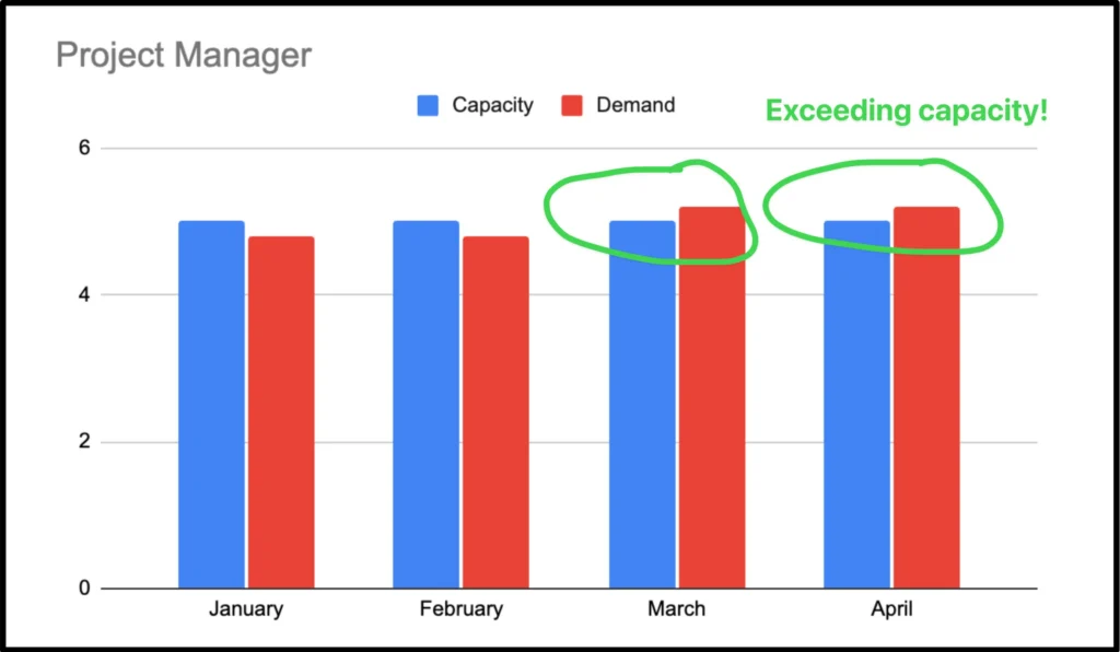 This chart shows demand vs. capacity for Project Managers. Wherever demand exceeds capacity, the plan doesn’t hold—and something has to give.