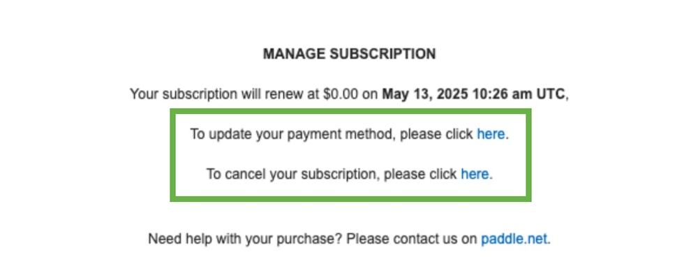 Paddle provides an easy-to-use portal where customers can directly update their payment information or manage their subscription.
