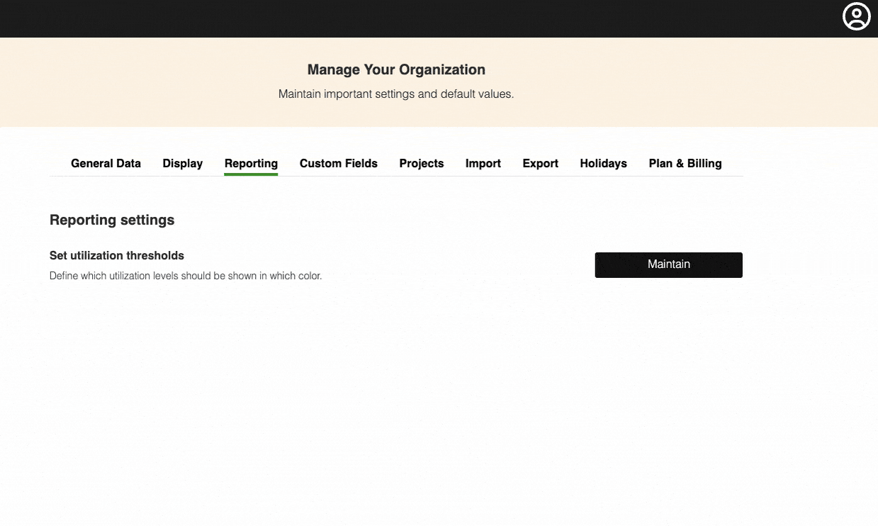 Go to Manage Organization → Reporting and click Maintain. This opens a dialog where you define how different utilization levels should appear in the report.