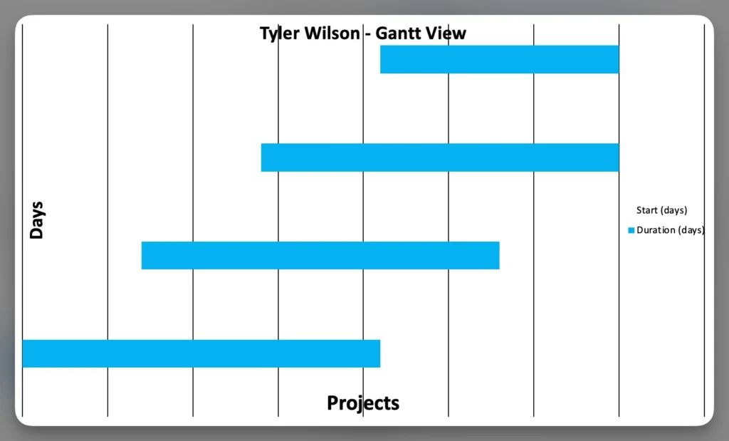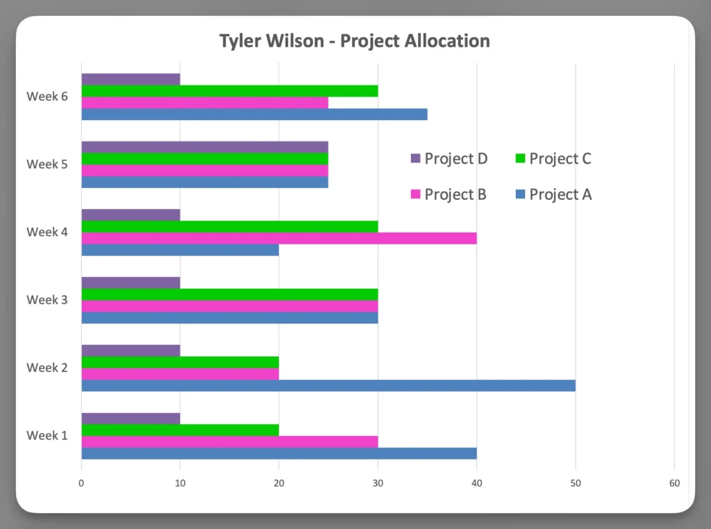 Here we are flipping the perspective. You start with a person and see all the projects they are working on, including how much time they spend on each. It typically looks like a table where each person has their own section, with projects listed underneath and allocation over time.