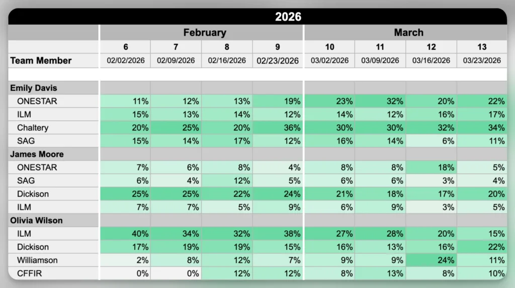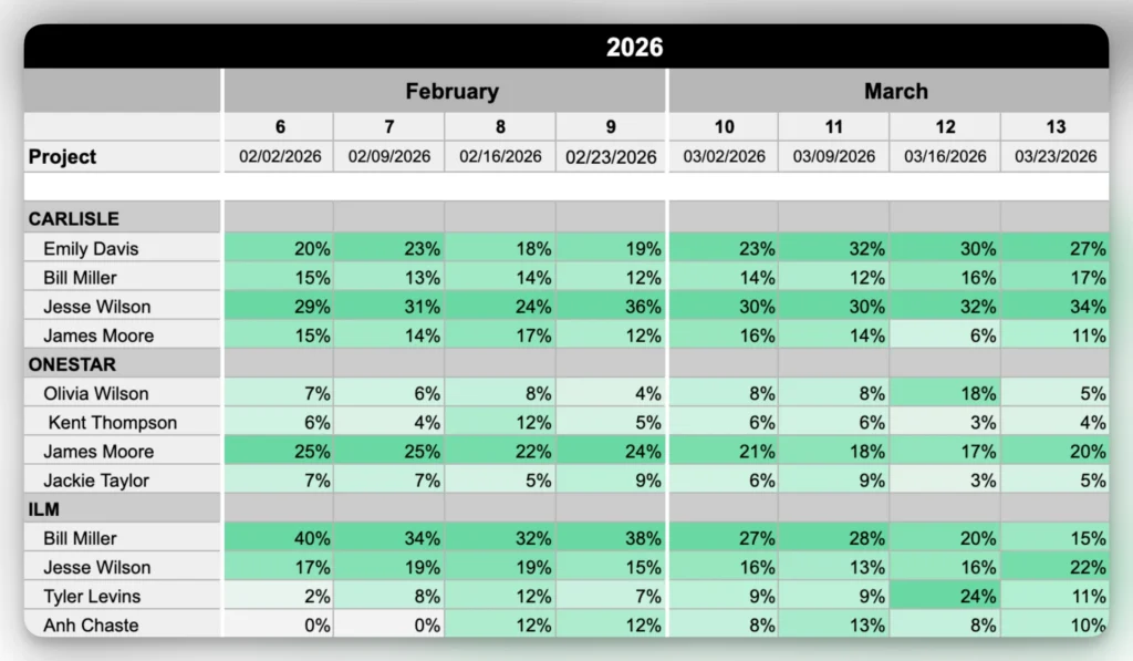 - Makes staffing over time visible: You can see how allocation changes across weeks or months, including ramp-ups, drop-offs or gaps.