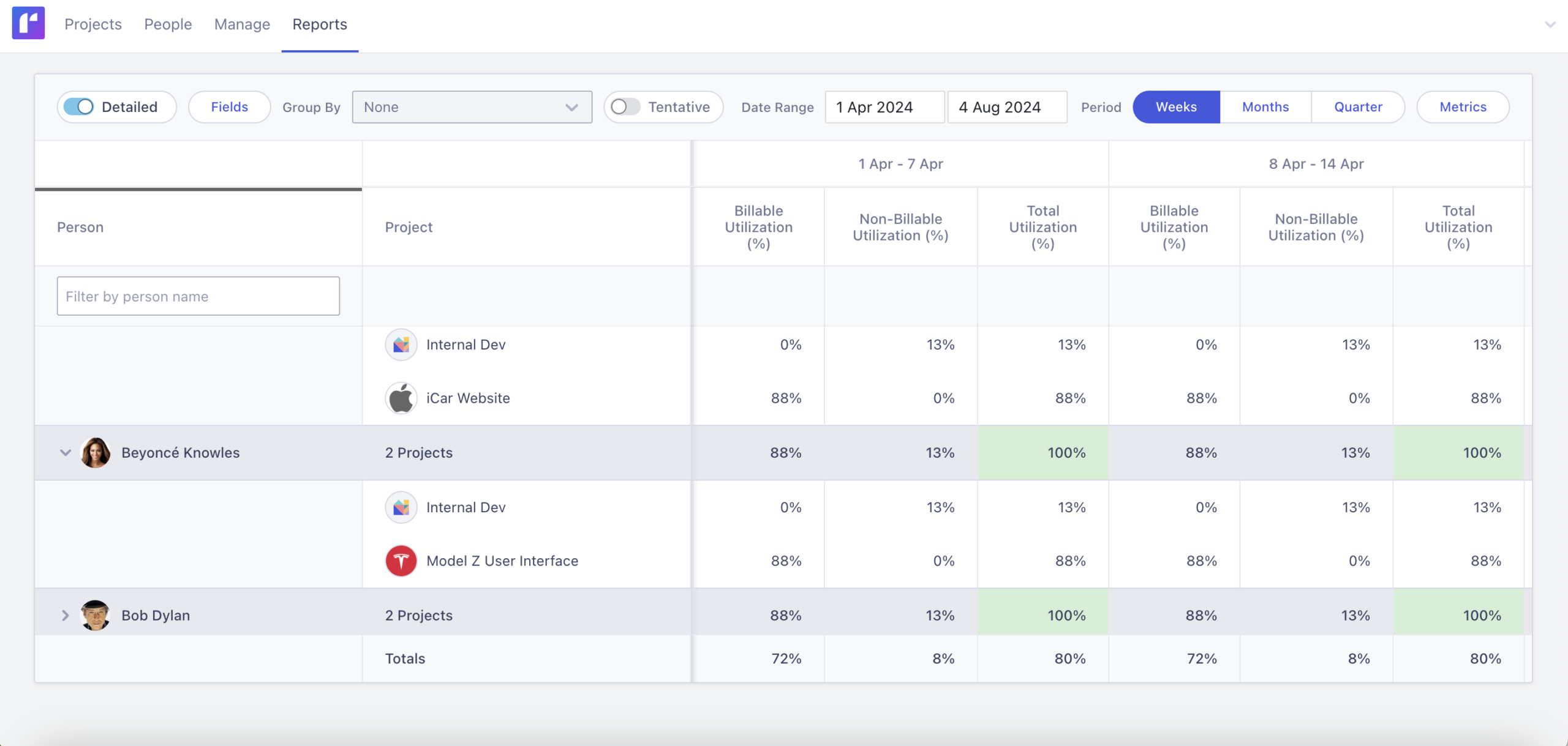 • Target utilization: A target rate can be set per person. The report shows actual versus target, making it easy to see who is consistently above or below expectations.