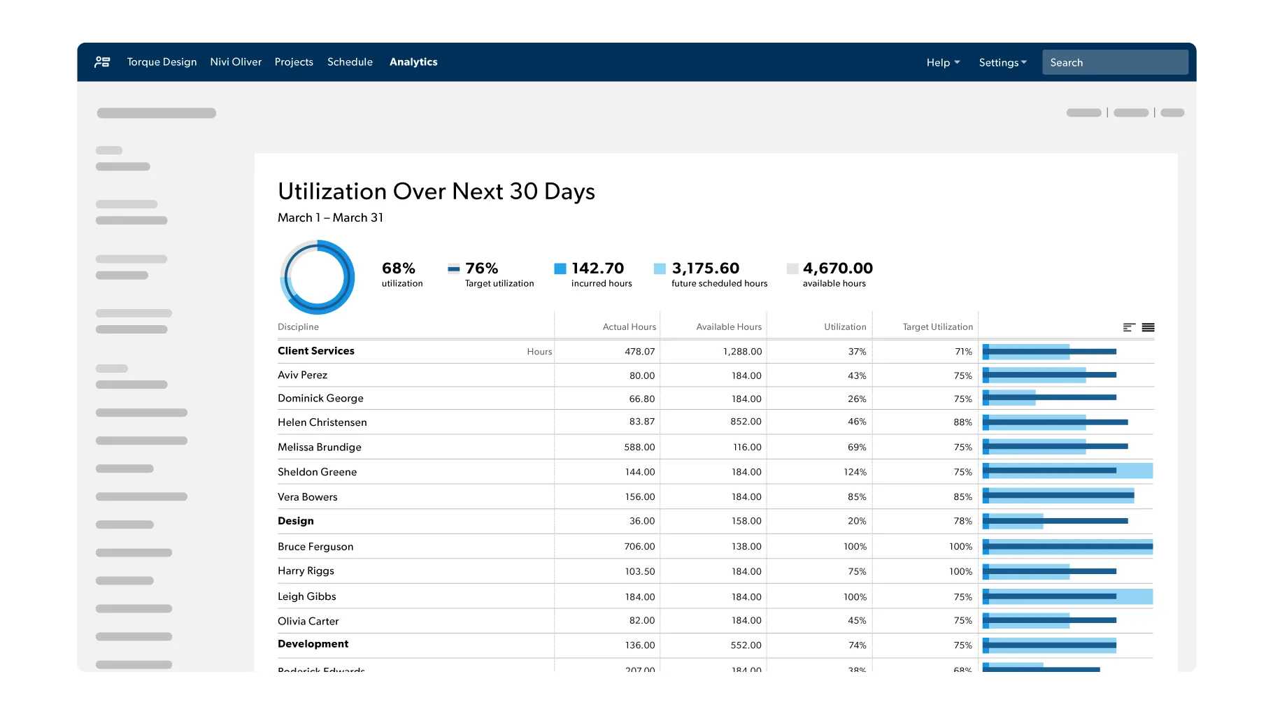 • Capacity forecasting: Projects utilization weeks or months ahead based on current allocations and upcoming work.