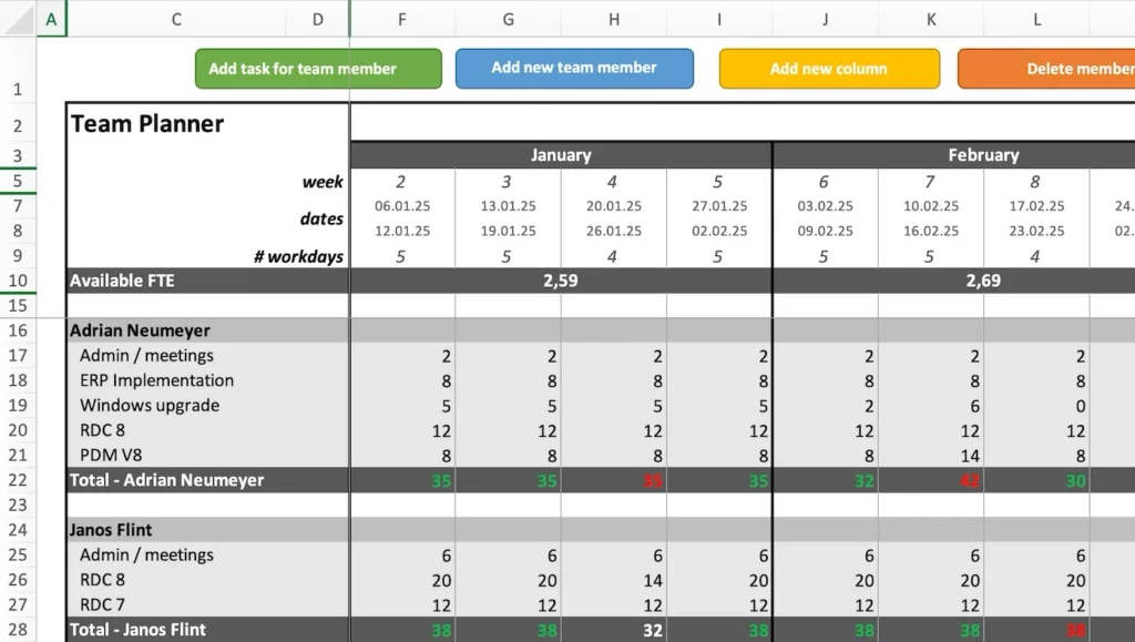 Once laid out, you can quickly compare planned allocations with each person’s available capacity — and see who has room and who is overbooked.